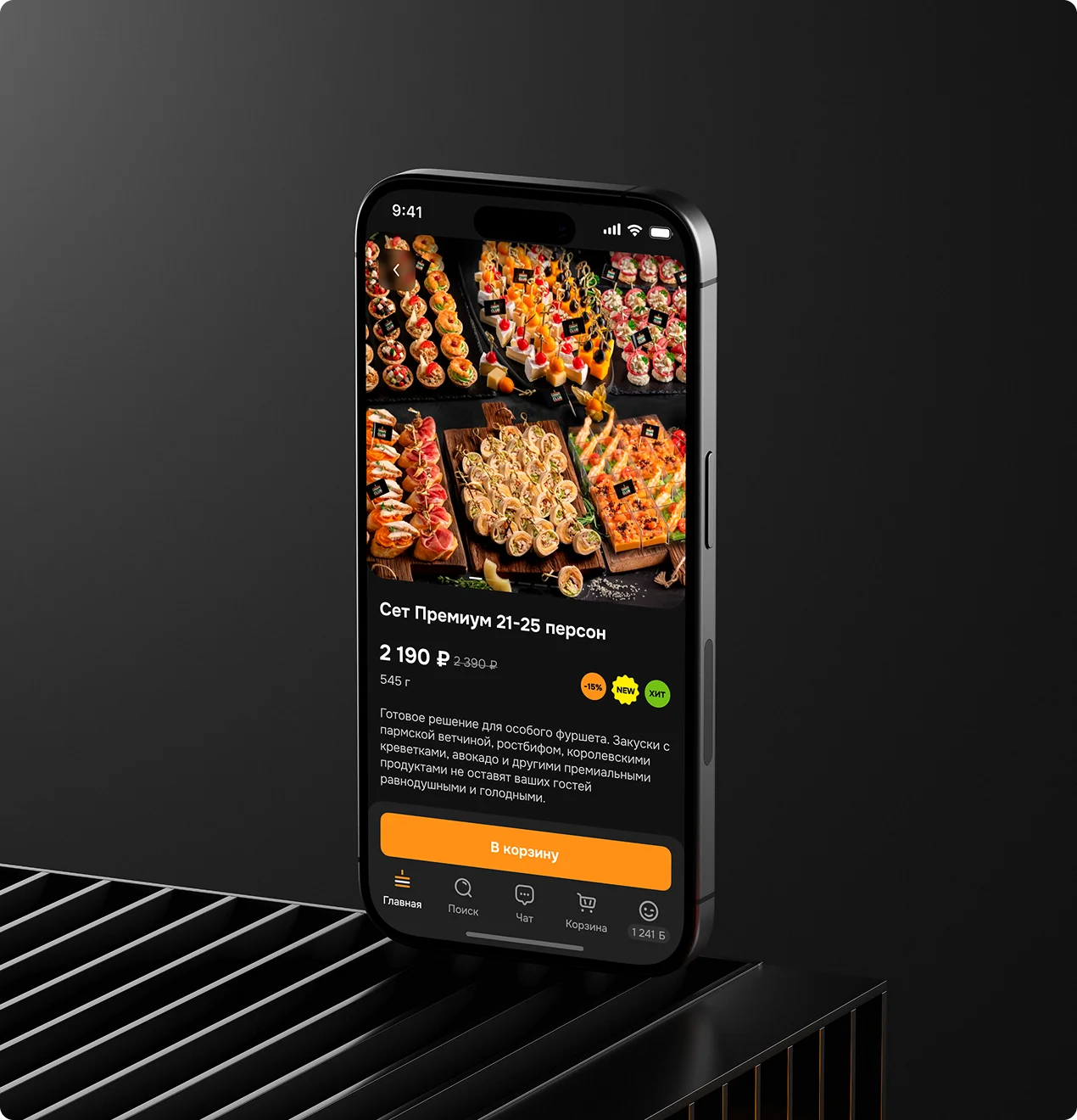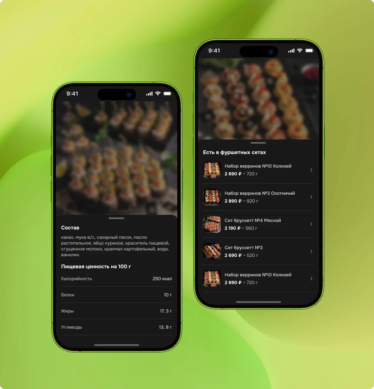 Мы реализовали карточку товара, которая позволяет легко настраивать количество порций, просматривать фотографии, изучать составляющие, пищевую ценность и даже аллергены.